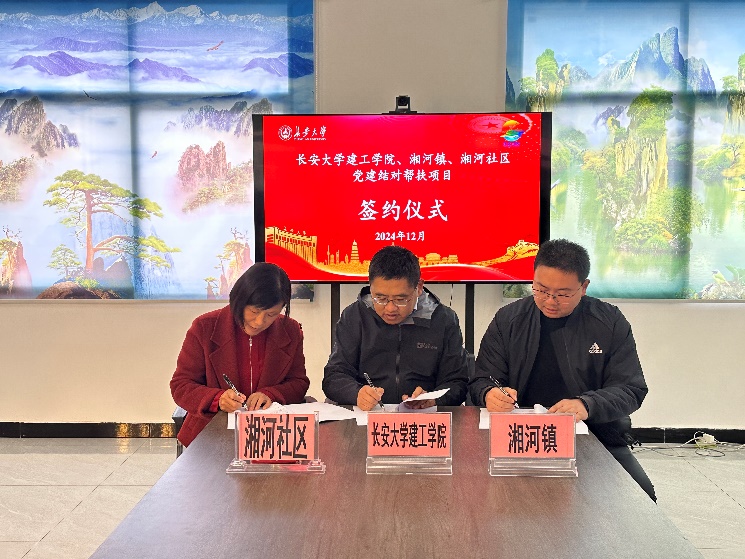 12月3日,建工学院、商南县湘河镇以及湘河社区举行长安大学-商南县党建结对帮扶项目合作协议签约仪式。建工学院党委书记吴涛、党委副书记、副院长孟庆鹏、党委秘书王子诺、建环与市政联合党支部书记孟庆龙,商南县城建局副局长段留省、湘河镇副镇长丁一、湘河社区党支部书记王景云、莲花台村驻村第一书记付石等人参加本次签约仪式。会后,一行人员赴“智慧灌溉赋能‘茶旅融合’,结对帮扶助力乡村振兴”项目合作所在的茶山进行实地考察。