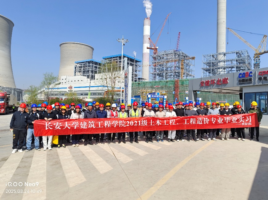 走进商洛电厂在建二期项目,直径接近90米、高度200余米的冷凝塔施工现场内部,令同学们对宏大的工业构筑物产生震撼,现场聆听了项目负责人介绍大体积混凝土、预制构件拼接、测量等施工技术难点及解决方案,让同学们体会所学知识在工程技术领域的实践应用。