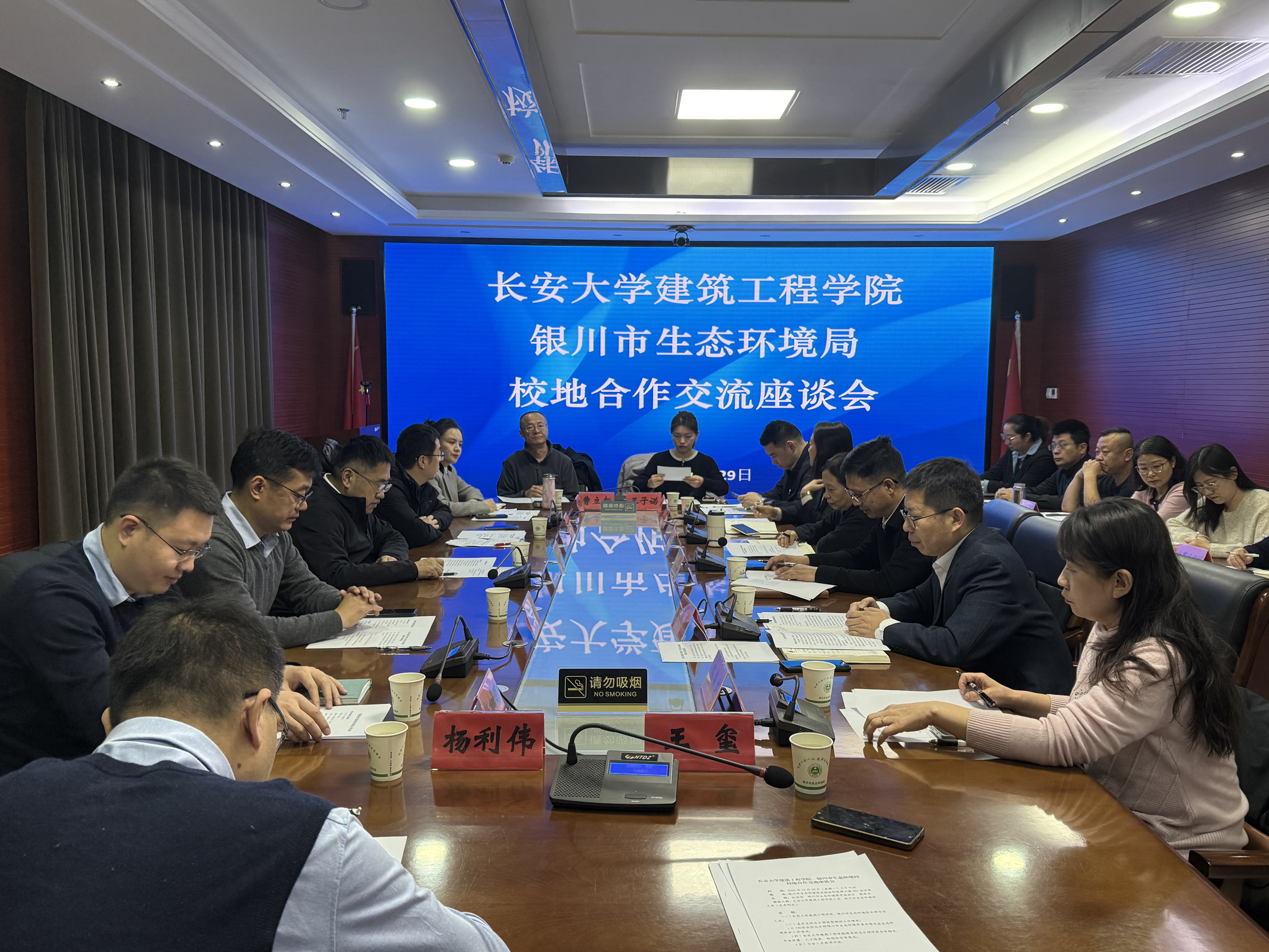 2025年12月29日上午,建筑工程学院党委书记吴涛、院长邢国华带队前往银川市生态环境局开展校地交流,并看望慰问挂任银川市生态环境局党组成员、副局长的学院教师孟庆龙。银川市生态环境局党组成员、副局长李淑娟、二级调研员高晓杰等局领导和相关业务科室负责人、学院党委副书记、副院长孟庆鹏、党委副书记马熠航、校党委组织部秘书杨树明等出席,座谈会由银川市生态环境局党组成员、副局长向伯安主持。