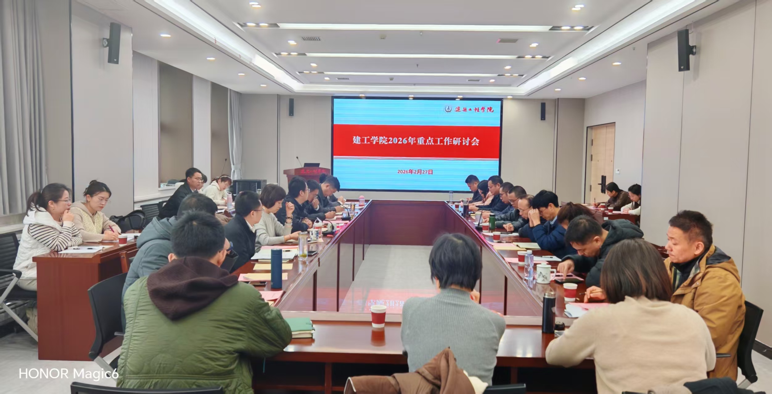 2月27日上午,建工学院在北校区学院第一会议室召开2026年重点工作研讨会,剖析2025年工作成效,研讨2026年工作思路,院领导班子、各系室主任和副主任,全体科级干部参加会议,院长邢国华主持会议。