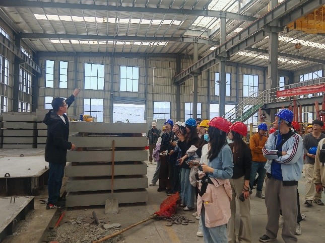 在装配式构件展示区,技术人员讲解了预制叠合板的生产工艺流程,包括组模、预埋件安装、钢筋绑扎、混凝土浇筑、振捣密实、养护及吊装堆放等环节。智能中控系统实时监控生产过程,确保钢筋桁架焊接质量、混凝土配比精度及构件尺寸精度。此次实习使同学们深刻认识到建材质量对工程结构安全的重要性。
