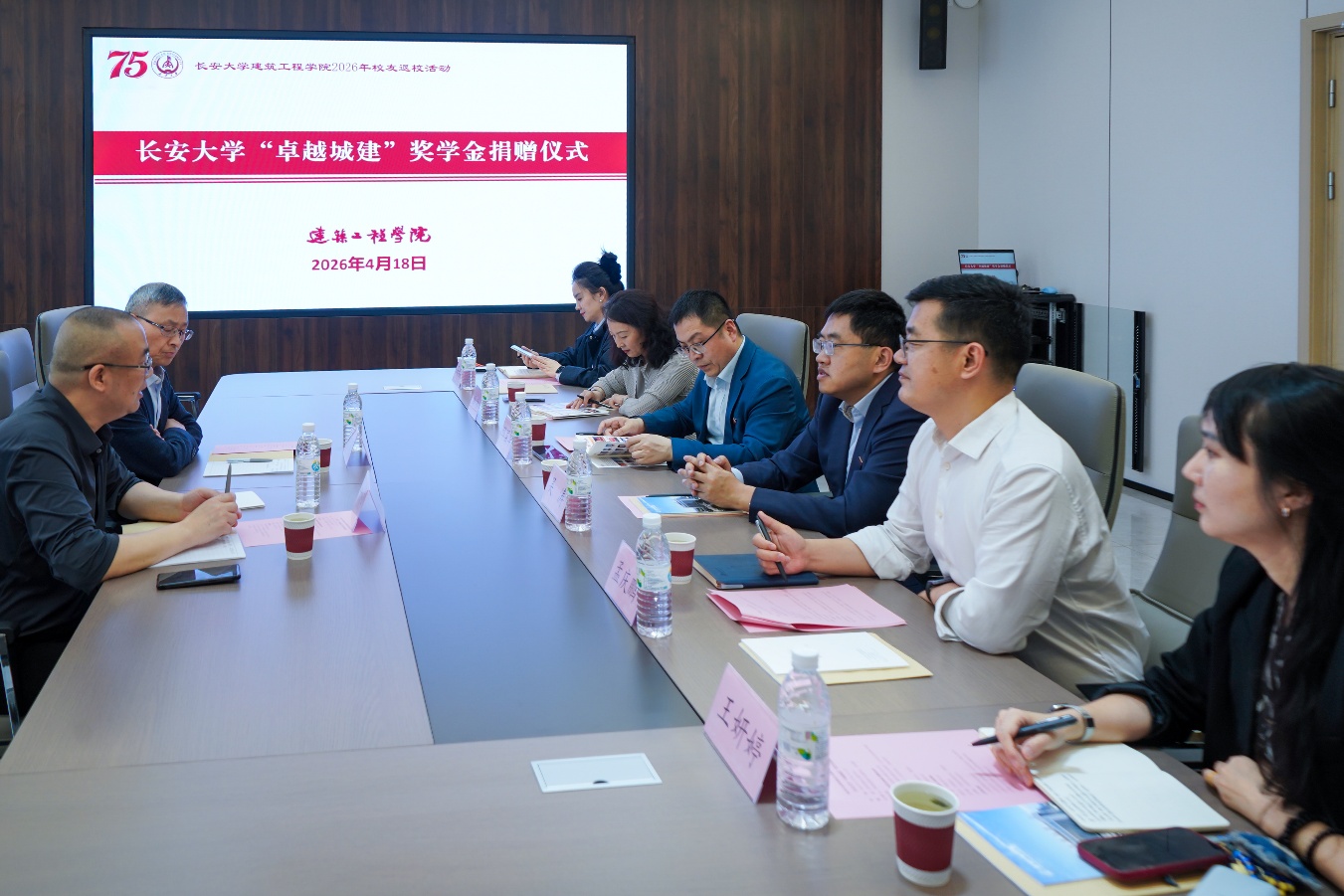 4月18日下午,长安大学“卓越城建”奖学金捐赠仪式在北校区致远大厦E207举行。浙江校友会城乡建设分会会长顾益力,浙江校友会城乡建设分会顾问吴光辉,建筑工程学院党委书记吴涛、院长邢国华、学院党委副书记马熠航,建筑学院党委副书记、副院长冯鹃,建筑学院党委副书记王妍婷参加。仪式由建筑工程学院党委副书记、副院长孟庆鹏主持。